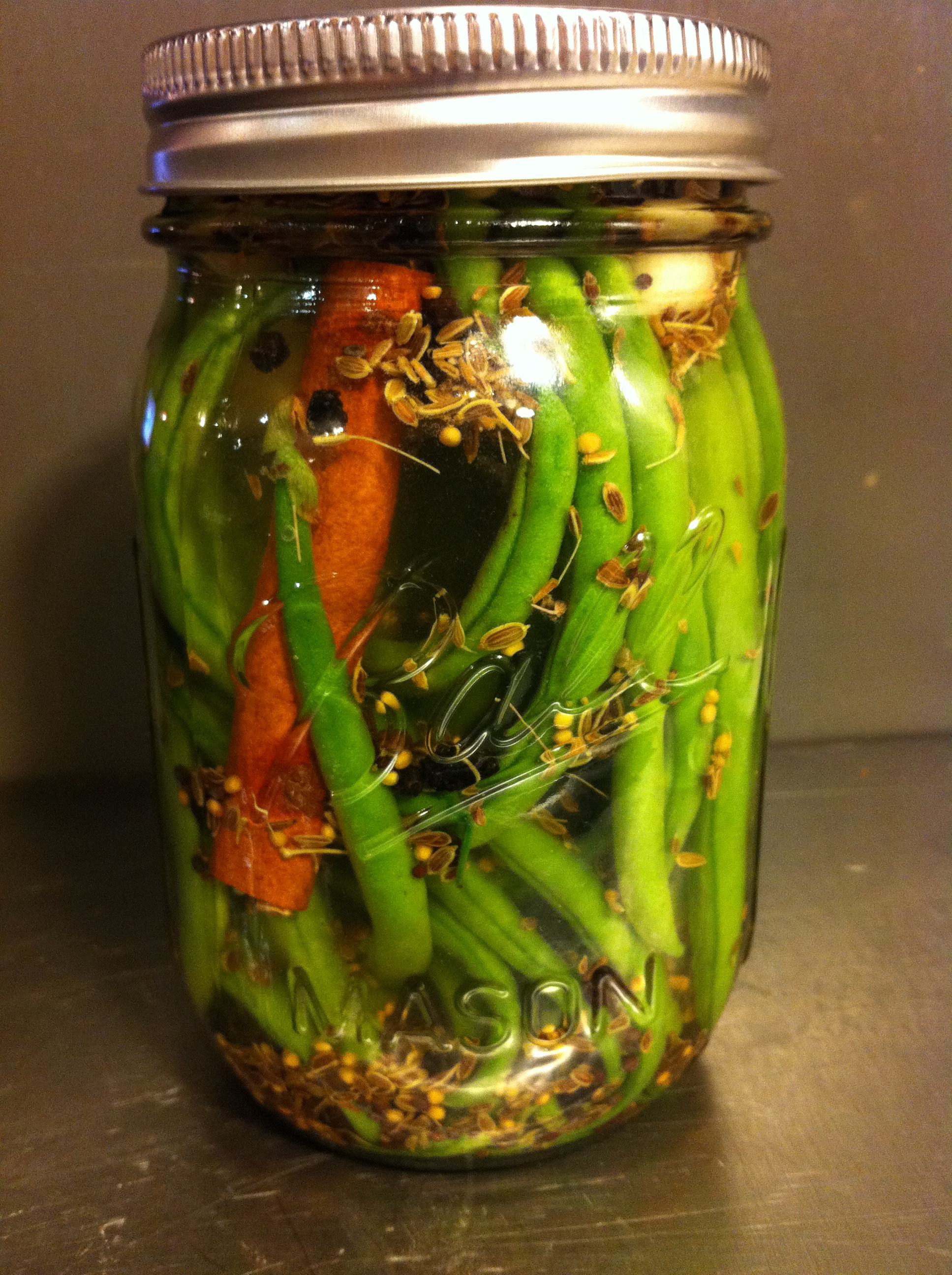 Add one third of the green beans, garlic, spices and salt to each jar. Fill each halfway with vinegar (about 1/2 to 3/4 cups). Top off each jar with cool water. Seal each jar with a lid, and shake gently to dissolve the salt and distribute the spices. Refrigerate for at least 3 days.