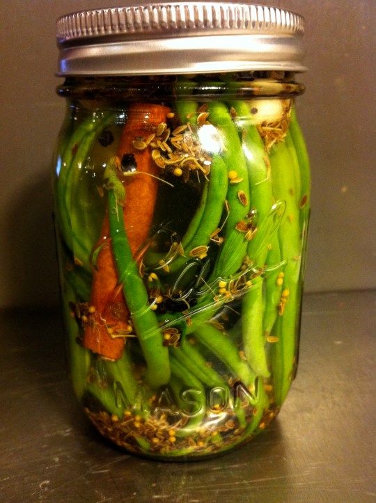 You’ll need 3 clean pint jars with lids. Or if you only have a few green beans, cut the recipe in thirds and make one jar. I just stuck this batch in the fridge, so I did not need to obsess about readying my equipment and keeping a sterile laboratory-type environment. I’ll post more on canning another time. For now, here’s an amazingly easy recipe to try.