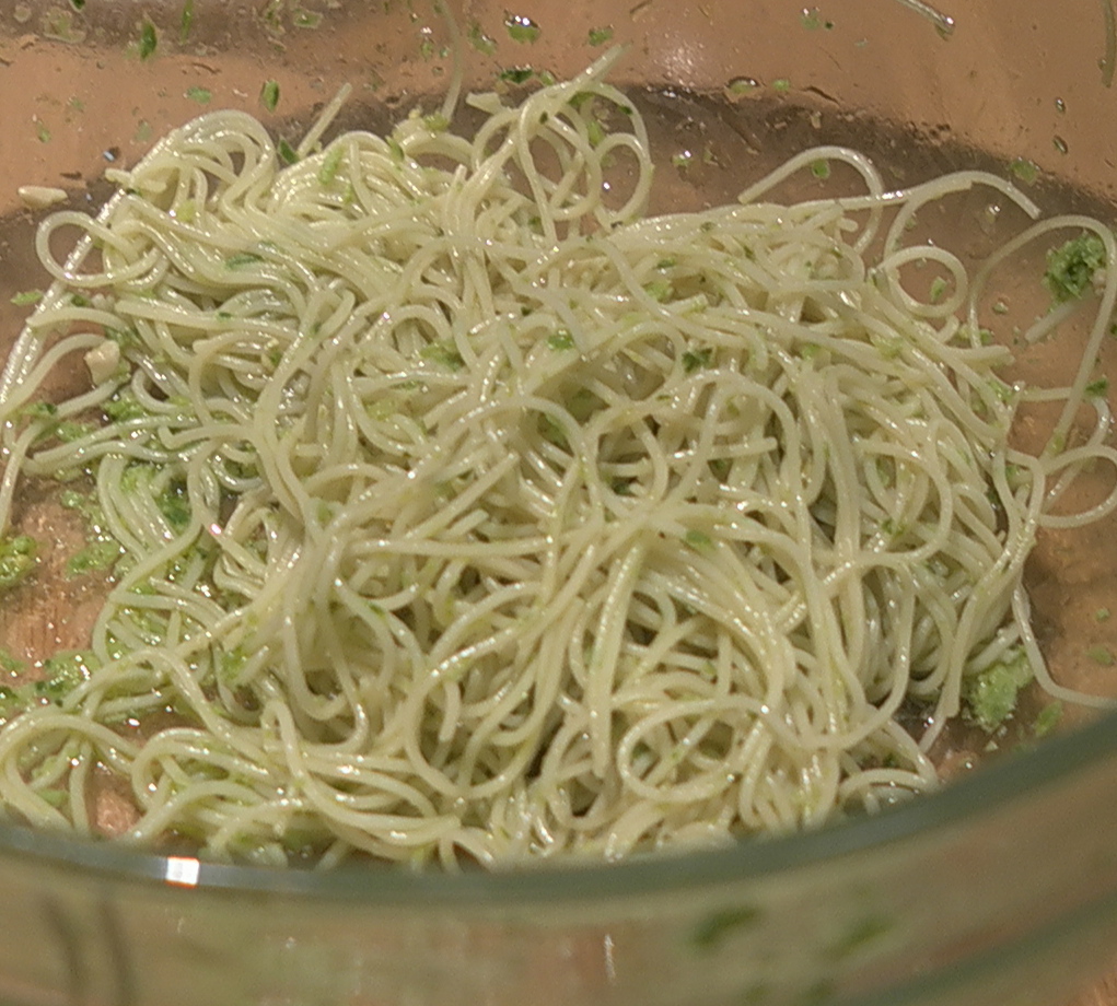 If you have too much pesto, you can freeze whatever you won’t eat that day. I used a few tablespoons of it with some angel hair pasta and a bit of the pasta’s cooking sauce. I froze the rest in ice cube trays for future meals.