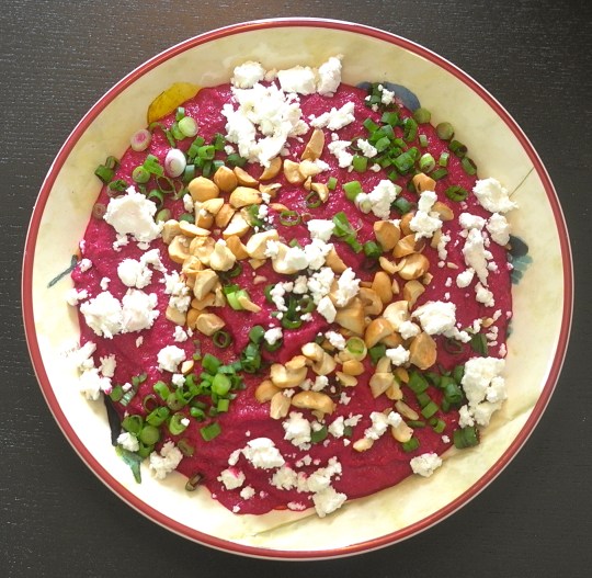 - Peel the beets, cut into wedges and transfer to a food processor. Add the garlic, chile and yogurt and pulse until blended. Add the olive oil, maple syrup and za’atar and puree. Season with salt. Scrape into a wide, shallow bowl. Scatter the hazelnuts, goat cheese and scallions on top and serve with bread.