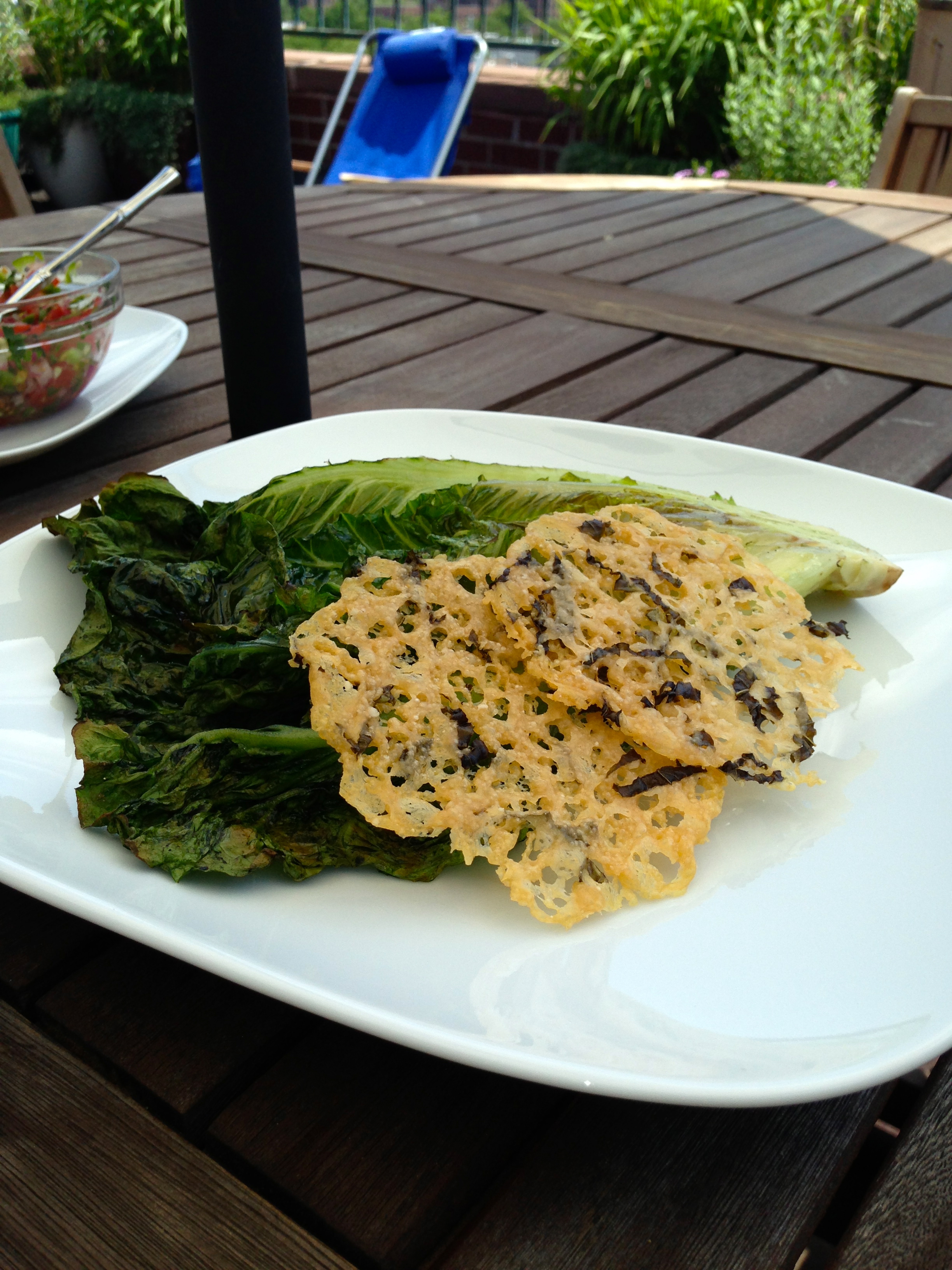 With the recent abrupt onset of summer, our grill has been getting some good use lately. Although I love grilling vegetables (asparagus, potatoes, eggplant, and portabellas are among my favorites), I kept my greens off the flames until today. I’m happy to report a new vegetable will now be part of the regular rotation. The parmesan basil crisps on top of the lettuce add the necessary crunch. Also, parmesan cheese might be one of the best foods out there and making these crisps seemed like a fun experiment to try on this quiet Sunday.