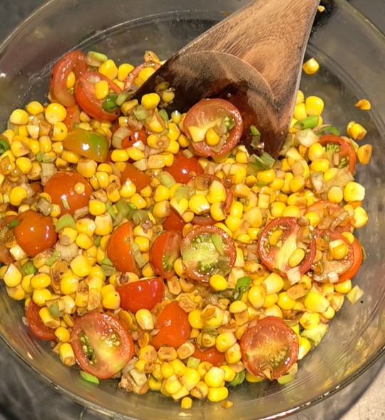 Corn and tomatoes play the starring roles in this simple salad, as the scallions and balsamic win best supporting ingredients. They all work together to create an interesting combination of flavors: an end-of-the-summer party in your mouth.