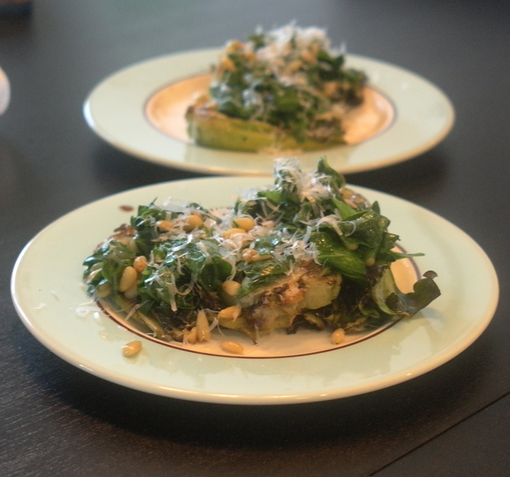 - After flipping the heads the first time, heat up the remaining oil in the small fry pan. When hot, add pine nuts or walnuts and toast slightly for a minute or two. Add chopped baby bok choy leaves and salt and pepper. Stir constantly until wilted, but still very green (about 2 minutes). Remove from heat.