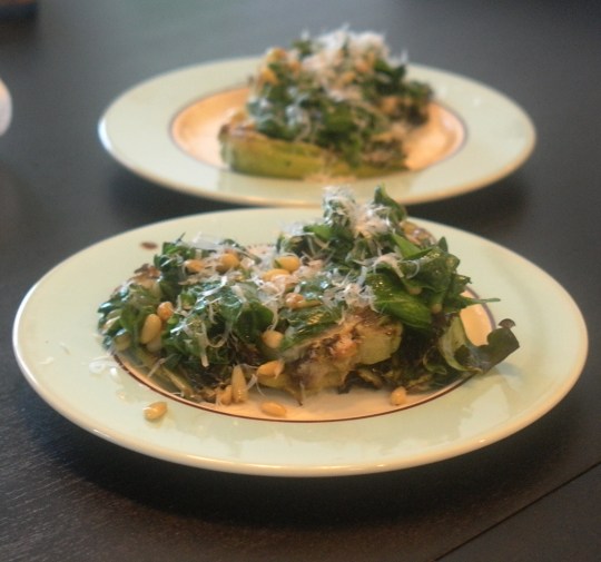 - To assemble the dish, put heads on plate and top with leaves, nuts and a sprinkle of cheese. Add more balsamic vinegar if desired.
