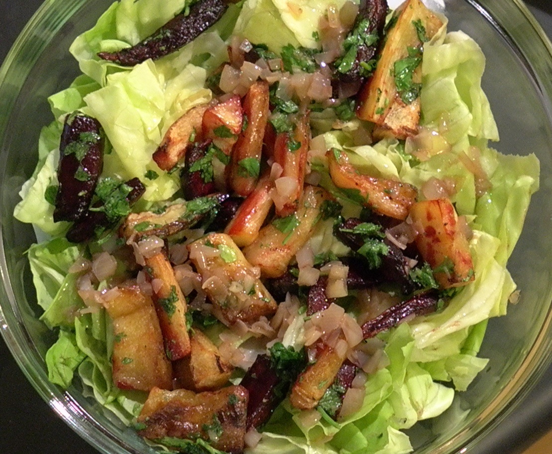The Sang Lee CSA started for the season last week, and there is an interesting combination of root vegetables, greens, and other little surprises. This salad uses beets from last week and the parsnips, lettuce, and parsley from this week. This salad is great when served warm, but can also be served cold.