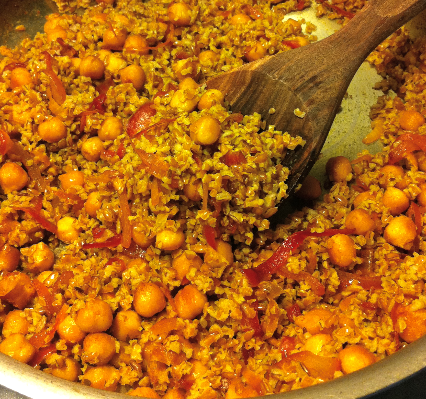 In the class, we used freekah instead of bulgur. You can also substitute Israeli couscous. This salad can be served hot, warm, or cold.