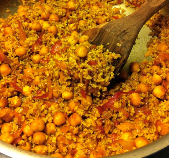 4. Remove and discard the bay leaves, and stir the bulgur into the chickpeas. Season with salt to taste, and serve hot, warm, or at room temperature.