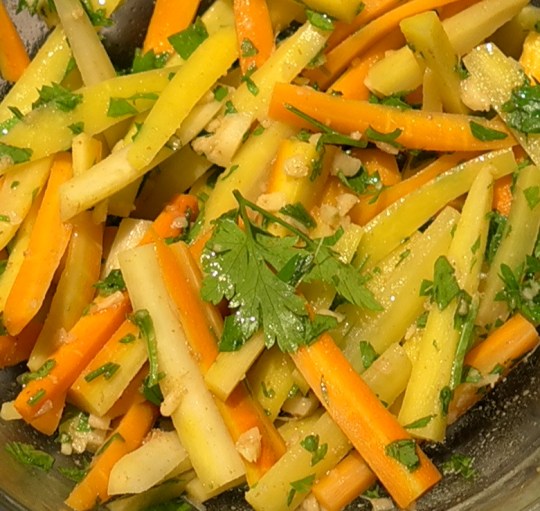 - Just before serving, whisk together lime juice, olive oil and parsley or cilantro. Pour over carrots and toss gently. Taste for seasoning and add salt or lime juice as needed.