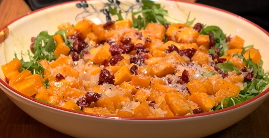 - Place the arugula in a large salad bowl and add the roasted squash mixture, the walnuts, and the grated Parmesan. Spoon just enough vinaigrette over the salad to moisten and toss well. Sprinkle with salt and pepper and serve immediately.