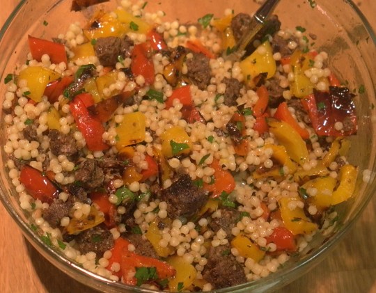 3. Preheat a grill to medium-high heat. Grill sausages and peppers, basting with the reserved 2 tablespoons dressing and turning frequently. When sausage is cooked through and peppers are tender, 10 to 15 minutes, remove from grill. Slice sausage into 1/2-inch-thick rounds and peppers into bite-size pieces. Put in a bowl with couscous. Toss with olive oil-lemon dressing and parsley. Taste and adjust seasoning. Serve warm or at room temperature.