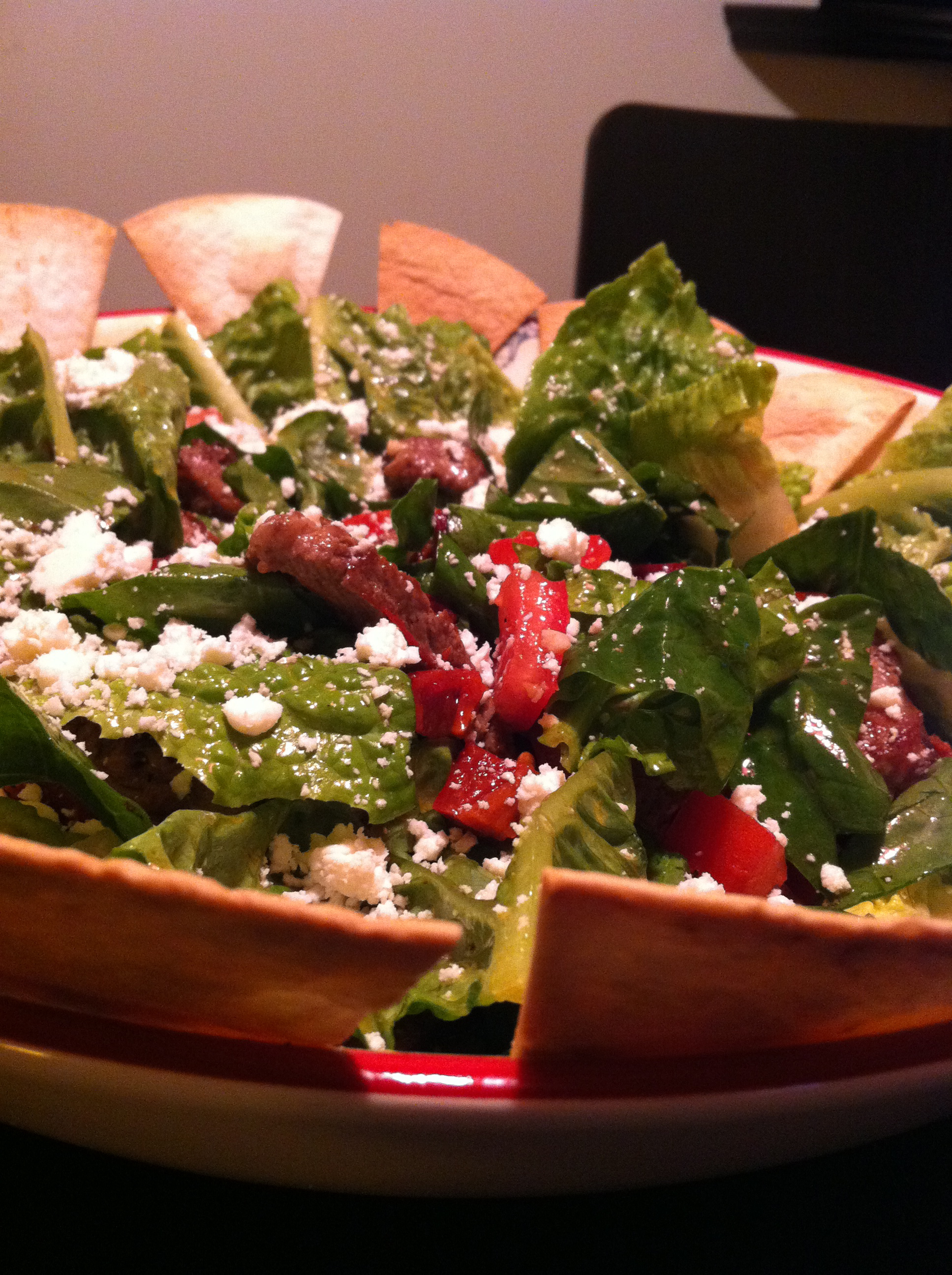 This recipe was adapted from Rick Bayless’ Mexican Everyday. He suggested using frisee or escarole, but we had baby spinach and romaine–so we used that. We also substituted the suggested queso anejo for cotija cheese.