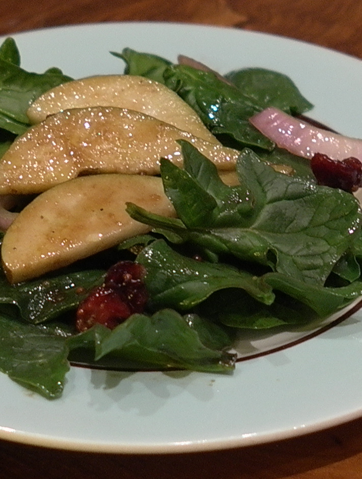 - To assemble the salad, place the spinach, onions, and pears in a large bowl. Give the remaining dressing a last-minute shake and pour over the salad. Toss to coat evenly. Arrange the salad in a large serving bowl or divide it evenly among 8 salad plates. Scatter the cranberries over the top(s). Serve immediately.