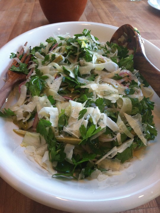 I recently got back from a wonderful weekend of cooking at Peter Berley’s kitchen on the North Fork of Long Island. The theme of the weekend was cooking with local foods in the winter. This salad stood out to me because of its unusual combination of flavors that seemed to go perfectly together. I had a healthy serving of it with some homemade foccacia for lunch on Sunday at the workshop. I enjoyed it so much that I made it on my own again Sunday night for dinner with friends. Every last piece of parsley was eaten up. Prior to trying this salad, I was not a fan of the fennel. However, shaving fennel with a mandoline helps to keep the flavor mild and delicious. This salad is a light and fresh complement to any meal.