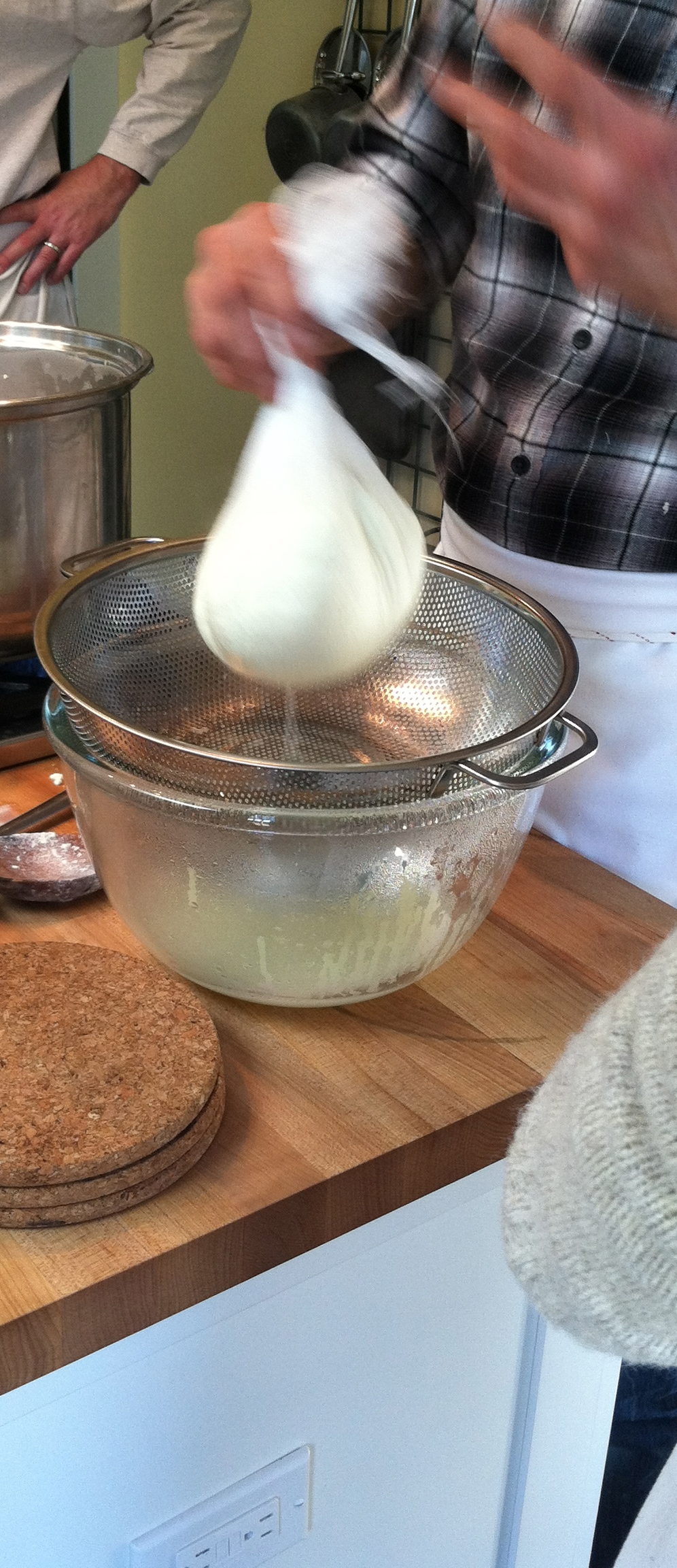 3. Once the curds form, remove from heat and ladle the curds into the cheesecloth to strain. You should put the cheesecloth over a colander which is over a bowl. I learned that what’s dripping out is whey, and you can use it for watering the plants.
