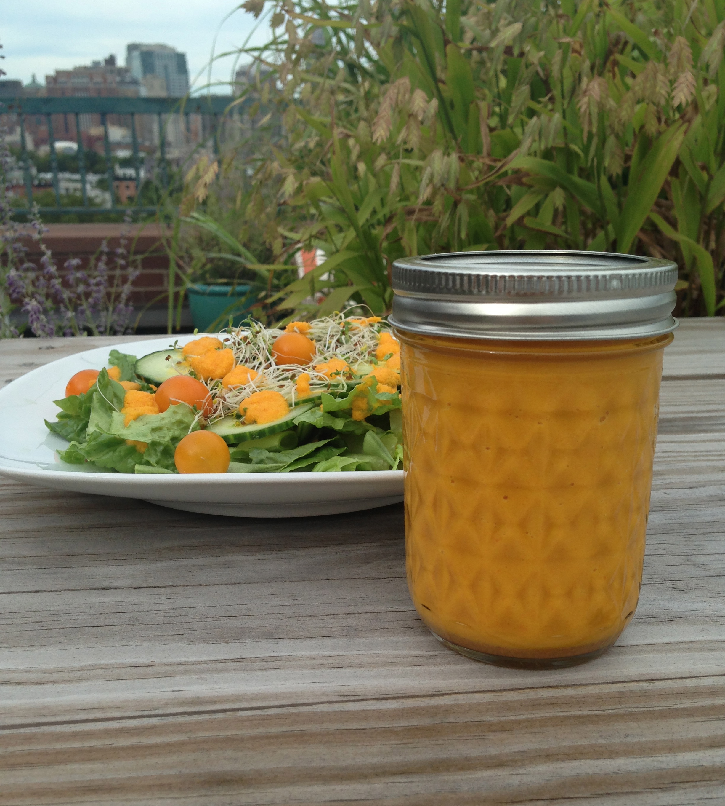 It will keep in an airtight container in the fridge for a week or so. The salad in the picture has lettuce, roma beans, cherry tomatoes, sprouts, and thinly sliced cucumbers. I actually think a great appetizer would be thicker cucumber slices with a dollop of this orange gold on top.