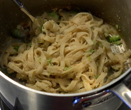 - Pour mixture over noodles and add the scallions.