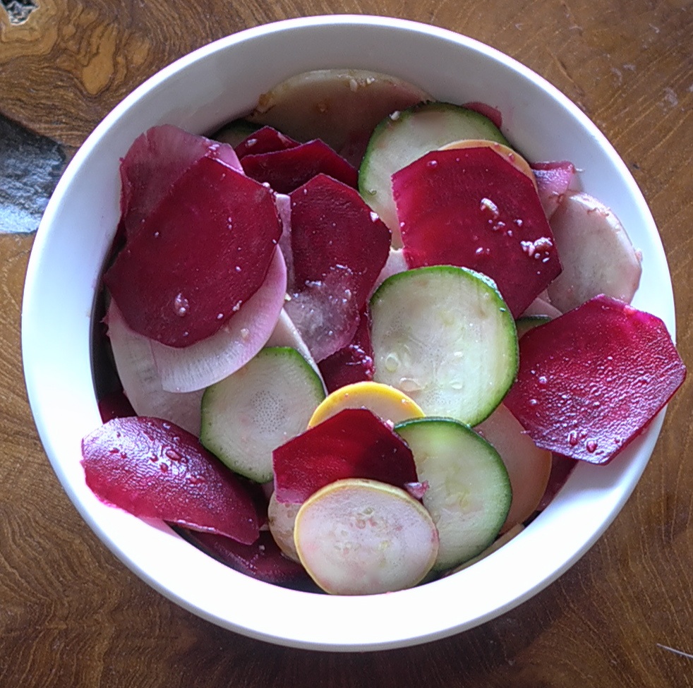 Use a mandoline to thinly slice all of the vegetables and combine in a large bowl. Then, make the dressing: